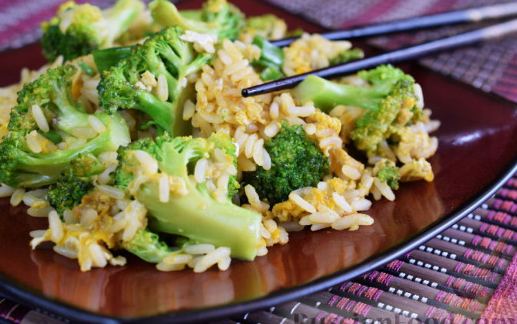 Промиваємо рис, заливаємо водою. Ставимо варитися. Додаємо дрібку солі. Тим часом подрібнюємо моркву, цибулю, часник і болгарський перець. У глибокій пательні розігріваємо олію, кидаємо туди овочі, часник, сушений чилі, спеції до рису, обсмажуємо на середньому вогні. Броколі розбираємо на суцвіття, ставимо каструлю, доводимо в ній воду до кипіння. На 4–5 хвилин занурюємо в окріп капусту. Зливаємо капусту. До пательні з підсмаженими овочами додаємо рис, ретельно перемішуємо, обсмажуємо кілька хвилин. Капусту не варто готувати занадто довго. Найкраща консистенція — це коли броколі трошки хрумтить. Перед подачею поливаємо соєвим соусом, перемішуємо на сковорідці та посипаємо кунжутом. Подаємо як самостійну страву або гарнір. Разом з овочами можна обсмажити шматочки курячого філе або індички, а також креветки чи інші морепродукти.